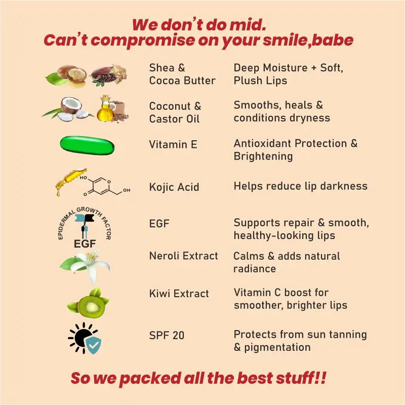 Softens Lips: Regular use helps to soften and smooth your lips, preventing any cracking or peeling.